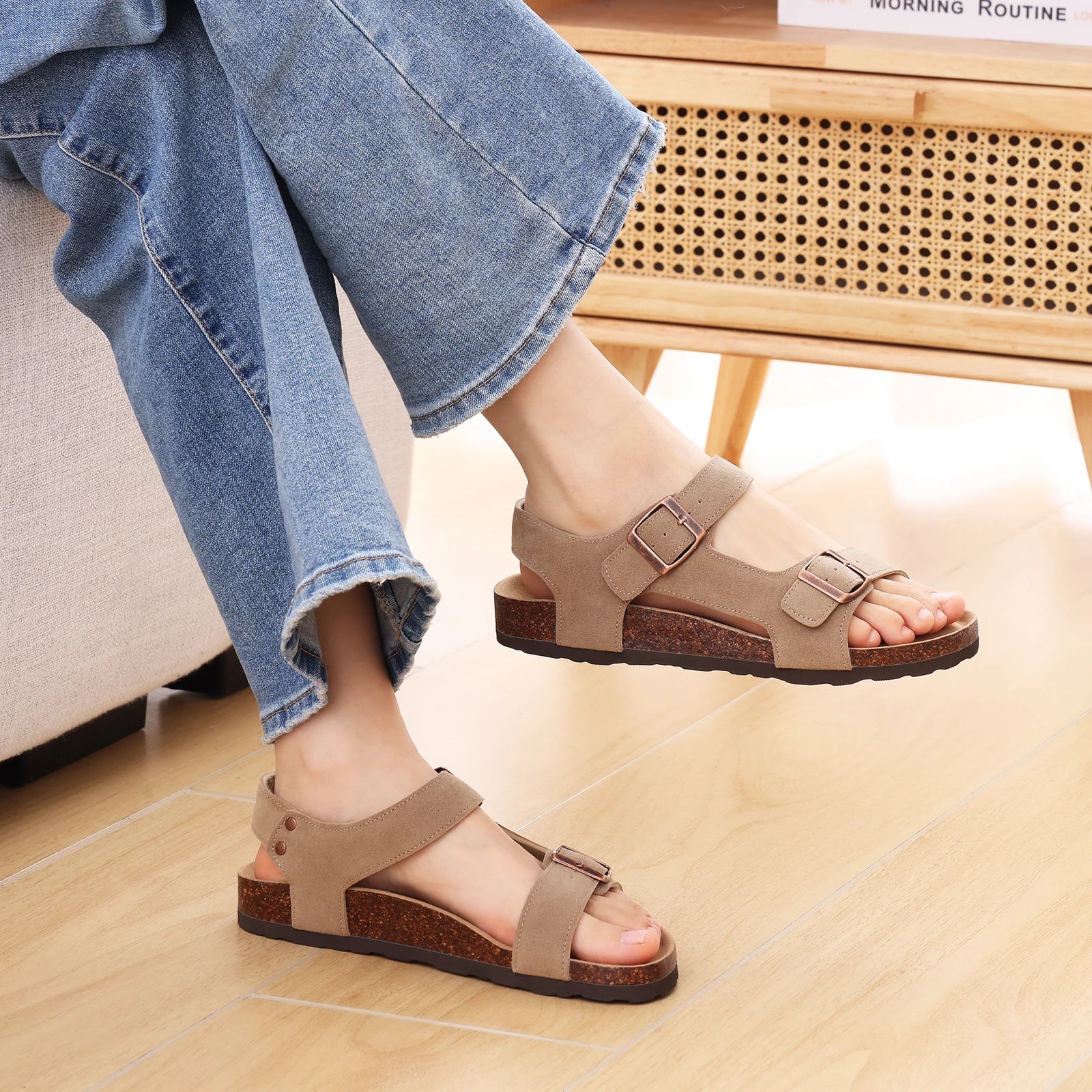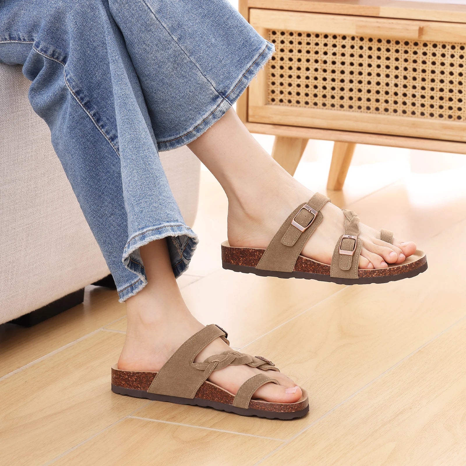 Redefining casual luxury, these sandals combine the raw, organic beauty of natural cork with the plush indulgence of fur. Perfect for the modern woman who values both ethical aesthetics and day-long wearability.